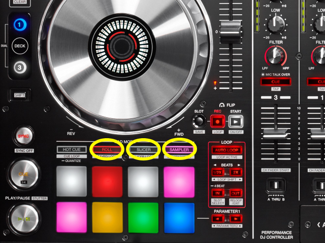 SX2には「HOTCUE」の他に、「ROLL」「SLICER」「SAMPLER」という機能があります。