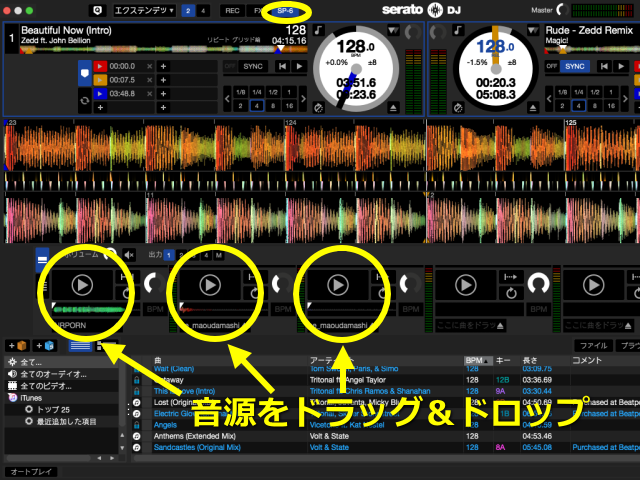 ここまで準備できたら曲の再生にうつります。SX2はデッキ(曲をスタンバイ・再生する一時的な保管場所)が4つあります。本体に「DECK」と書かれている部分がデッキです。まずは「DECK」の「1」(画像の黄色い丸で囲んだ場所)を押して、PC上のSerato DJ上の「1」に流したい曲をドラッグ&ドロップしましょう。