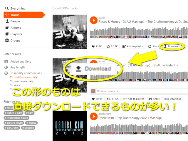 特に「↓Download」という表示の楽曲はSoundcloud上ですぐにダウンロードできるものが多いです。