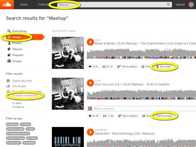 Soundcloudの検索画面で検索枠に「Mashup」と打ち込んで、左側の「Tracks」を選択し、さらに「To Modify Commercially(改変・商業OK)」を選択します。あとは楽曲の下の「Download」または「Free Download」からフリーダウンロードしてください。